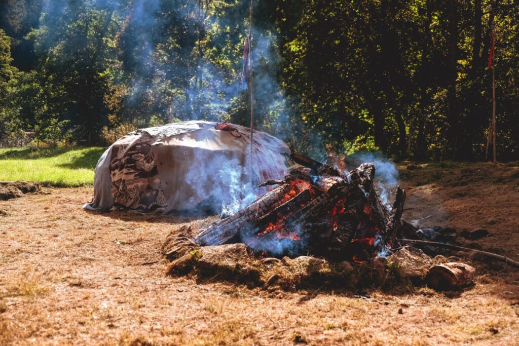 Budeme připravovat dřevo a dělat oheň, takže si vezmi pracovní oblečení. Do chýše je nejlepší nějaké bavlněné tričko a kraťasy a dámy třeba bavlněné šaty. A samozřejmě i ručník nebo dva. A také něco na sezení, například starou karimatku.